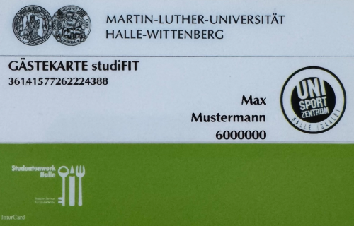 Die studiFIT card wird von allen Nutzern benötigt, die keinen gültigen Studenten- oder Mitarbeiterausweis der Martin-Luther-Universität Halle-Wittenberg besitzen. Sie ermöglicht den Zutritt in das gebuchte studiFIT für den Buchungszeitraum und muss einmalig erworben werden. Eine Rückerstattung ist ausgeschlossen.